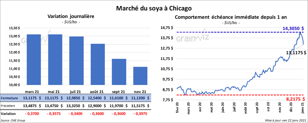 Les contrats de soya US aux échéances les plus rapprochées ont fini la session en baisse entre 34 et 37 cents. Quant aux contrats de tourteau de soya US aux échéances les plus rapprochées, ils ont également clôturé avec des pertes entre 16,60 et 19,70 $/tonne. Dans le cas des contrats d’huile de soya US aux échéances les plus rapprochées, ils ont fermé dans le rouge entre 2,67 % et 2,81 %.