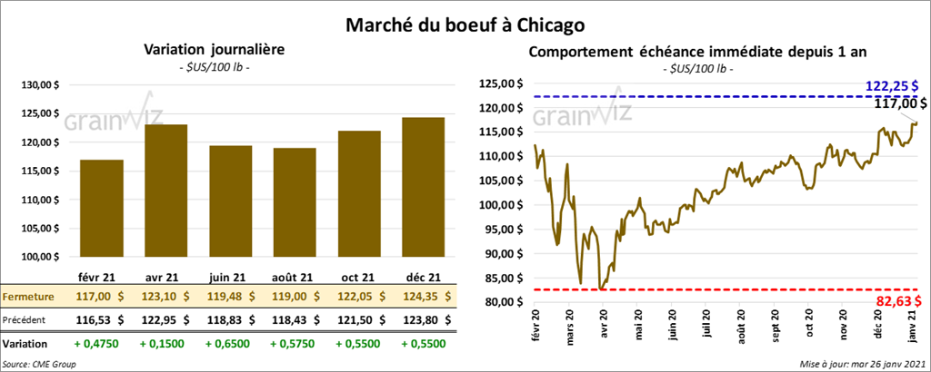 - Le 25 janvier dernier, le CME Feeder Cattle Index était en hausse de 48 cents à 134,96 $.