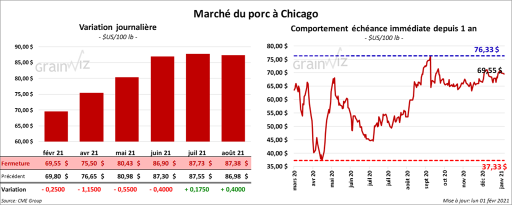 - Le 28 janvier dernier, le CME Lean Hog Index était en hausse de 11 cents à 67,40 $.
