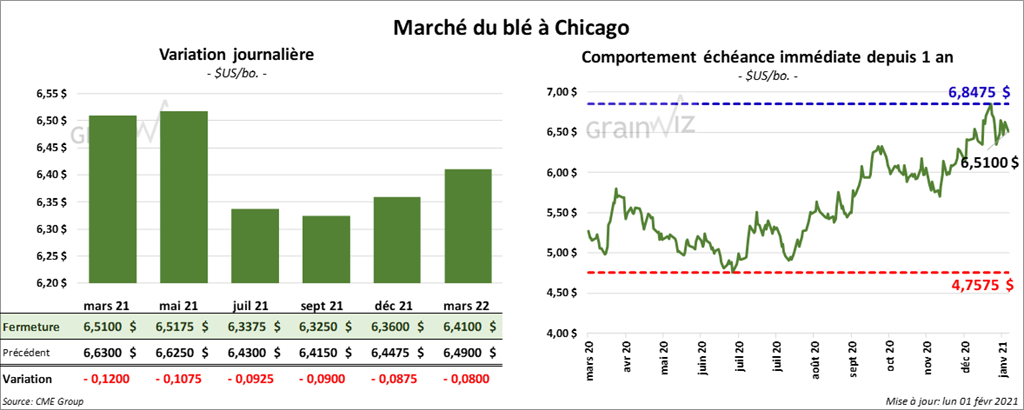 À Chicago, les contrats de blé aux échéances les plus rapprochées ont terminé la session en baisse entre 9 et 12 cents. À Kansas, ceux de blé dur rouge aux échéances les plus rapprochées ont fini la séance dans le rouge entre 9 ¾ et 13 cents. À Minneapolis, les contrats de blé de printemps aux échéances les plus rapprochées ont clôturé en recul entre 8 ½ et 10 ¾ cents.
