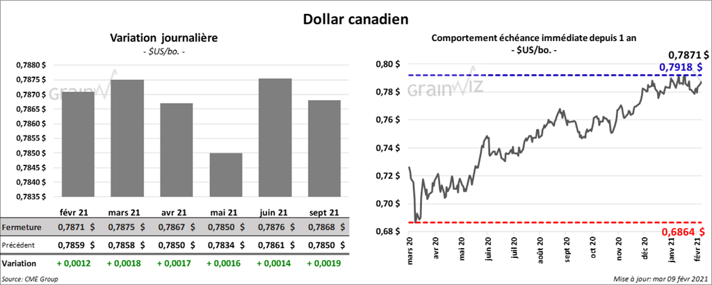 - Mondialement, l’USDA a évalué les stocks de fin d’année de blé 2020/21 à 304,22 millions de tonnes, ce qui est une baisse de 2,8 % par rapport aux prévisions des analystes. En janvier dernier, les inventaires mondiaux de fin d’année de blé avaient été estimés à 313,19 millions de tonnes et en février 2020 à 300,09 millions de tonnes. Comparativement à janvier dernier, l’USDA a laissé inchangée son estimation de la production de blé russe à 85,30 millions de tonnes. Par contre, il a abaissé celle de l’Ukraine de 300,000 tonnes à 25,20 millions de tonnes. Quant au Canada, il estime que la production de blé est demeurée la même depuis janvier dernier à 35,18 millions de tonnes. En février 2020, la production canadienne de blé avait été estimée à 32,67 millions de tonnes.