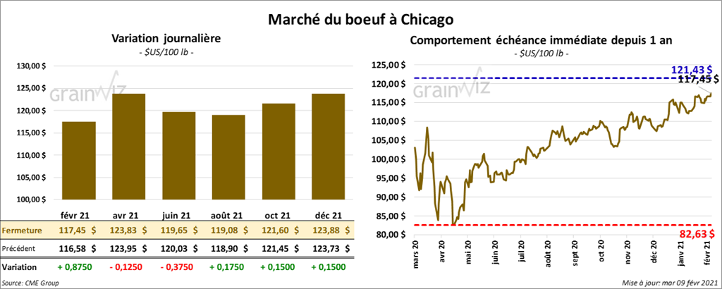 - Pour février, l’USDA a augmenté son estimation de la production de bœuf US 2021 de 350 millions de lb à 27,540 milliards de lb.
