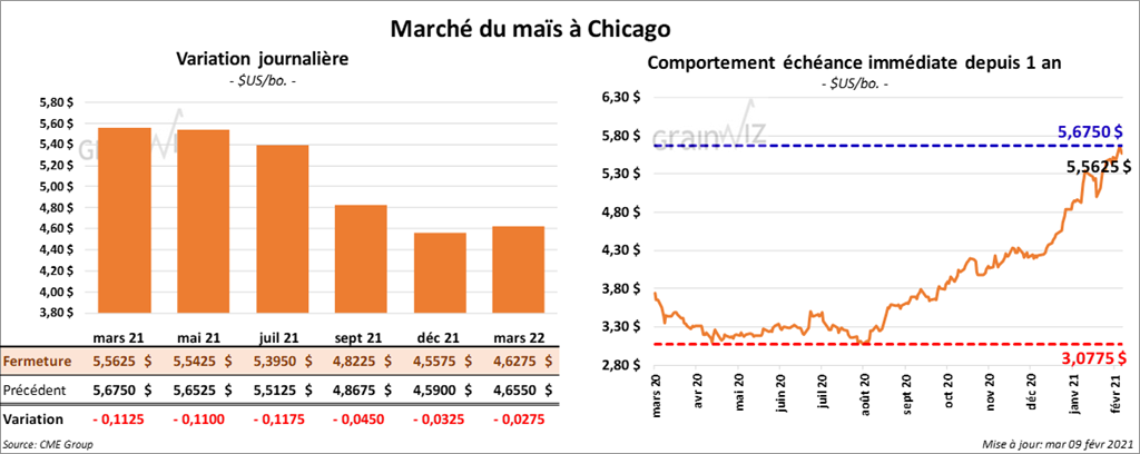 - Ce midi, l’USDA présentait son rapport d’offre et de demande du mois de février 21. Pour les inventaires de fin d’année de maïs US, il estime que ceux de 2020/21 sont de 1,502 milliard de boisseaux. Le résultat est supérieur aux attentes du marché par 7,9 %. Le mois précédent, l’USDA estimait que les stocks de fin d’année de maïs US 2020/21 étaient plus élevés à 1,552 milliard de boisseaux. Pour février de l’année commerciale 2019/20, les inventaires de fin d’année de maïs US avaient été de 1,919 milliard de boisseaux.