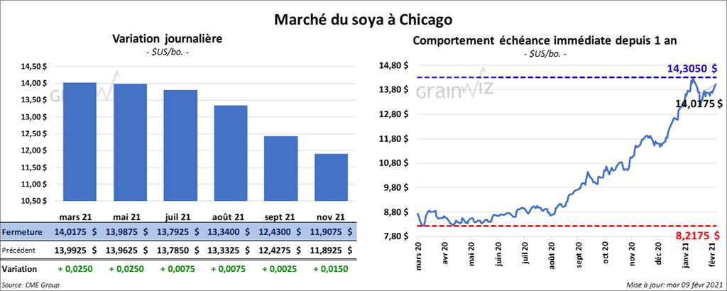 Les contrats de soya US aux échéances les plus rapprochées ont fini la journée en hausse entre ¾ et 2 ½ cents. Ceux de tourteau de soya US aux échéances les plus rapprochées ont terminé avec des gains entre 1,30 et 2,10 $/tonne. Les contrats d’huile de soya US aux échéances les plus rapprochées ont également fermé dans le vert entre 74 et 89 points.