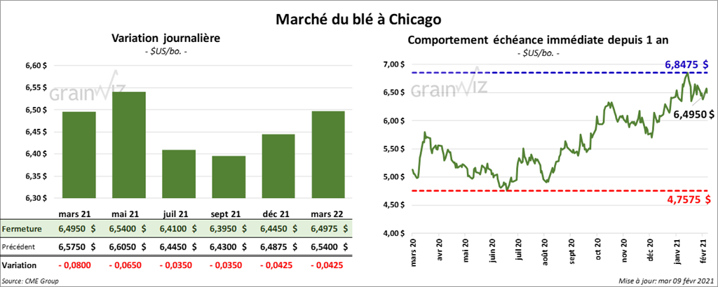 - Dans son rapport d’offre et de demande du mois de février, l’USDA a estimé les inventaires de fin d’année de blé US à un résultat inchangé par rapport à janvier dernier à 836 millions de boisseaux alors que les marchés s’attendaient à 834 millions de boisseaux. L’an passé, en février, l’USDA avait estimé les inventaires à 1,028 milliards de boisseaux.