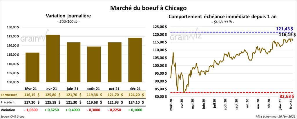 - Le 15 février dernier, le CME Feeder Cattle Index était en baisse de 1 cent à 135,60 $.