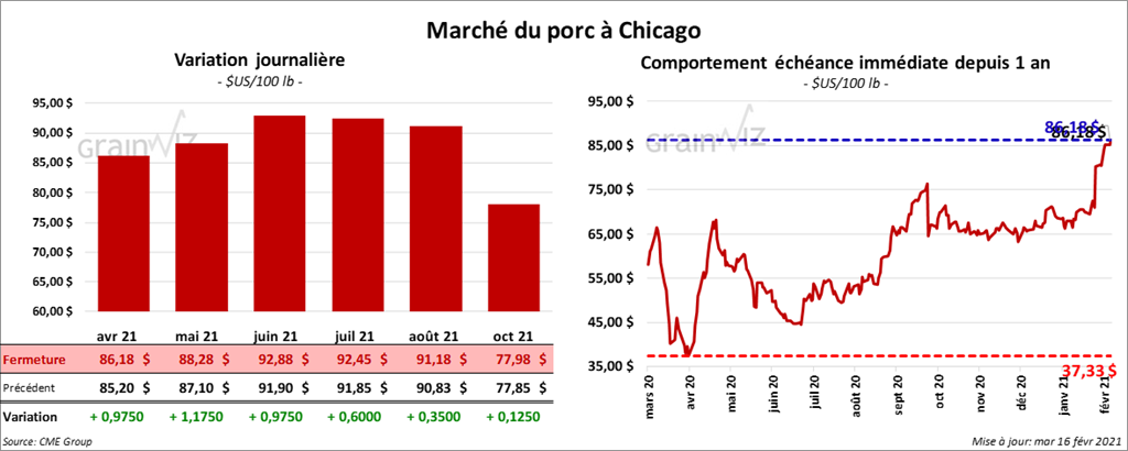 - Le 12 février dernier, le CME Lean Hog Index était en hausse de 1,39 $ à 74,54 $.