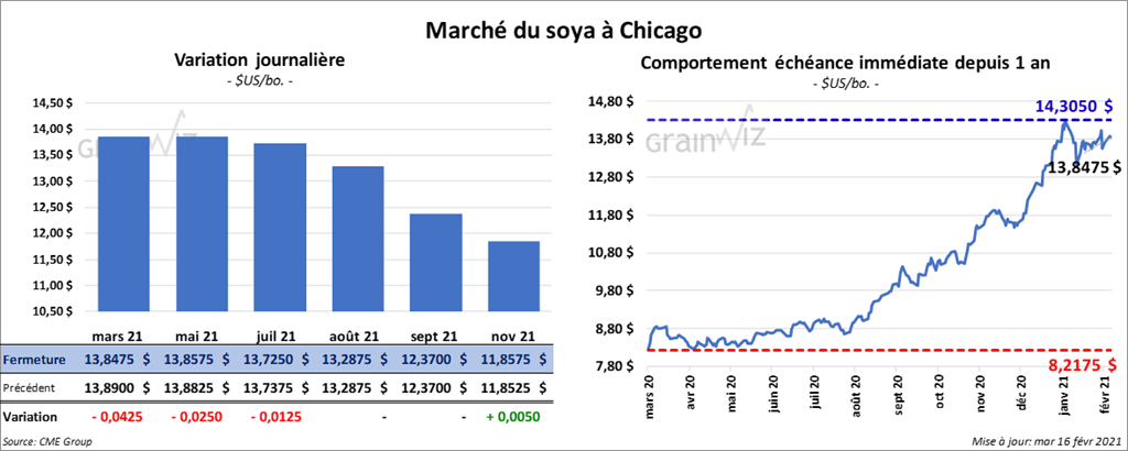Les contrats de soya US aux échéances les plus rapprochées ont fermé au neutre ou en baisse entre 1 ¼ et 4 ¼ cents. Ceux de tourteau de soya US ont fini en hausse entre 1,20 et 2,30 $/tonne. Les contrats d’huile de soya US aux échéances les plus rapprochées ont terminé la session en progression entre 2,67 % et 2,74 %.