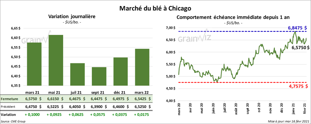 À Chicago, les contrats de blé US aux échéances les plus rapprochées ont fini la journée en hausse entre 5 ¾ cents et 1,00 $. À Kansas, les contrats de blé dur rouge aux échéances les plus rapprochées ont terminé la session avec des gains entre 18 ½ et 20 ¾ cents. À Minneapolis, ceux de blé de printemps aux échéances les plus rapprochées ont également fermé en progression entre 14 ¼ et 15 ¼ cents.