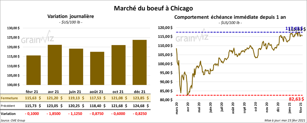 - Le rapport Cold Storage du mois de février a été publié cet après-midi. Il indique qu’au 31 janvier dernier, les stocks de surgelé de bœuf US ont été en baisse de 3,1 % par rapport au mois précédent à 519,186 millions de lb. C’était par contre une augmentation de 6,3 % comparativement au 31 janvier 2020. Dans les faits, il s’agissait des inventaires les plus élevés depuis ceux du 31 janvier 2017.