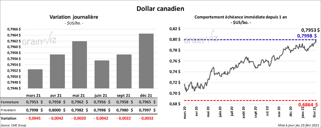- Durant la semaine du 18 février dernier, les ventes nettes à l’exportation de maïs US 2020/21 ont été de 453,300 tonnes, soit en baisse de 55 % par rapport à la semaine précédente et en réduction de 85 % comparativement à la moyenne des 4 dernières semaines. Le Pérou et le Vietnam ont été les principaux acheteurs. Du côté de 2021/22, les ventes nettes ont été de 145,900 tonnes. Le Mexique et le Japon ont été les plus gros acheteurs. Les anticipations des analystes étaient entre 1,0 et 1,6 million de tonnes. À noter que la baisse des ventes à l’exportation des grains peut être attribuable au congé du Presidents’Day (US) et de celui de la Nouvelle Année Lunaire (Chine).