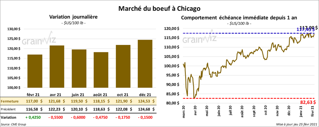 Les contrats de bœuf US aux échéances les plus rapprochées ont fini la session en baisse entre 17 et 60 cents. Ceux de veau US aux échéances les plus rapprochées ont fait l’inverse en terminant en hausse entre 5 et 42 cents.