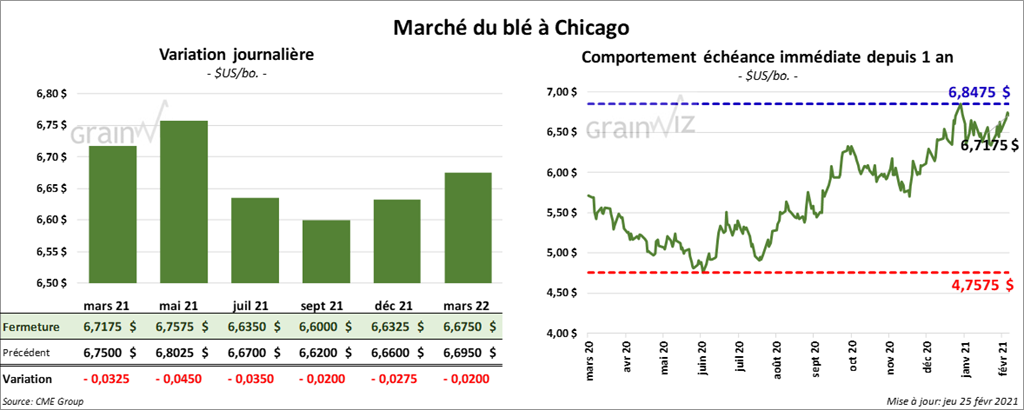 À Chicago, les contrats de blé aux échéances les plus rapprochées ont terminé la session en baisse entre 2 et 4 ½ cents. À Kansas, les contrats de blé dur rouge aux échéances les plus rapprochées ont fini la journée en recul entre 9 ½ et 11 ¾ cents. À Minneapolis, les contrats de blé de printemps aux échéances les plus rapprochées ont clôturé avec des pertes entre 5 et 7 cents.