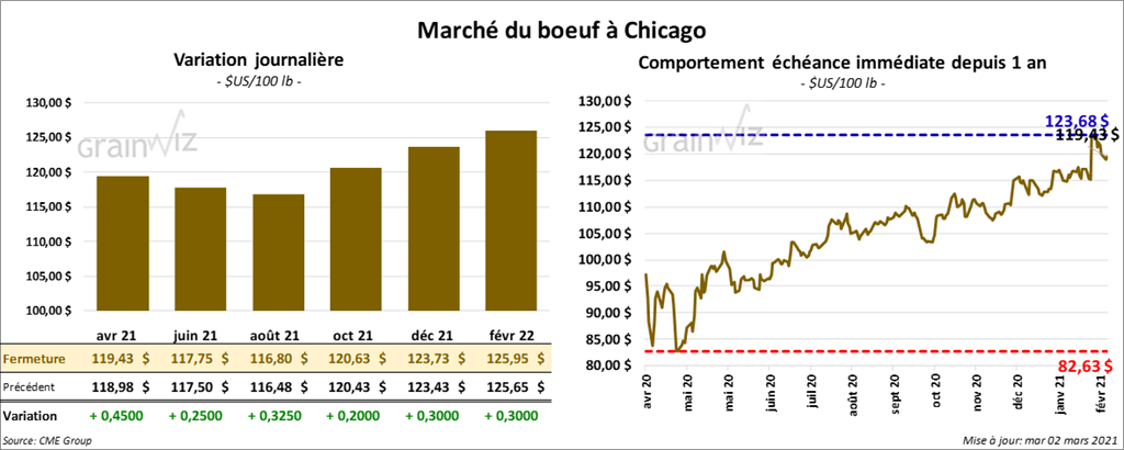 - Le 26 février dernier, le CME Feeder Cattle Index était en baisse de 56 cents à 138,35 $.