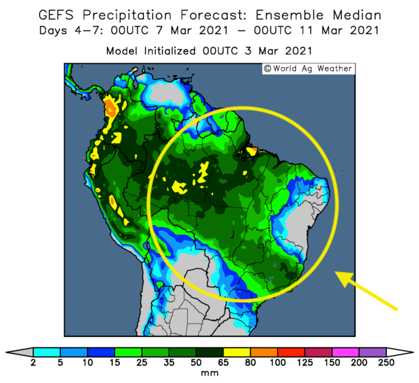 Cette carte montre les précipitations prévues au Brésil pour les 4 à 7 prochains jours