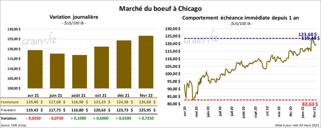 - Le 2 mars dernier, le CME Feeder Cattle Index était en baisse de 37 cents à 137,17 $.