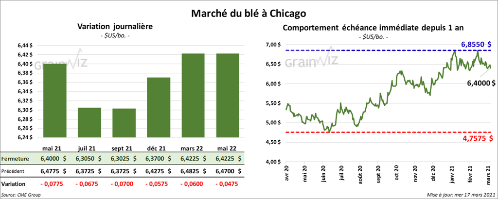 À Chicago, les contrats de blé aux échéances les plus rapprochées ont terminé la session en baisse entre 5 ¾ et 7 ¾ cents. À Kansas, les contrats de blé dur rouge aux échéances les plus rapprochées ont fermé avec des pertes entre 6 ½ et 7 ¼ cents. À Minneapolis, ceux de blé de printemps aux échéances les plus rapprochées ont aussi clôturé en recul entre 4 ½ et 5 ¼ cents.