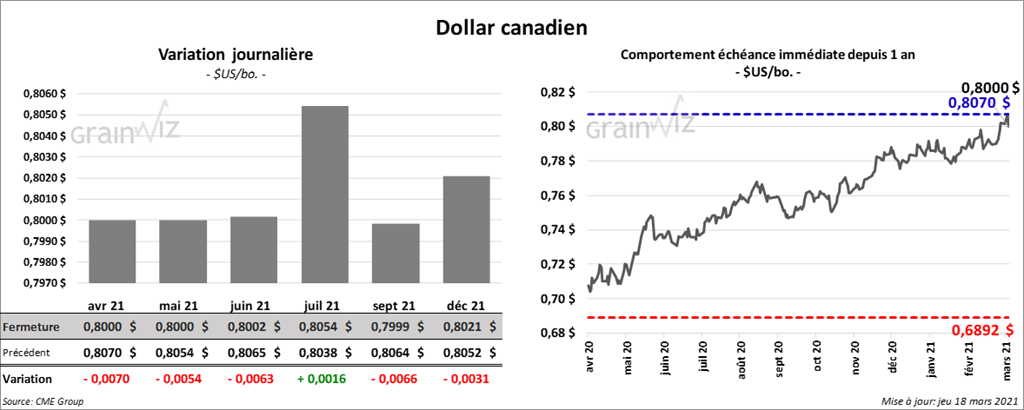 - Au cours de la semaine du 11 mars dernier, les ventes nettes à l’exportation de blé US 2020/21 ont été de 390,100 tonnes, soit à une augmentation de 18 % par rapport à la semaine précédente et à une hausse de 40 % comparativement à la moyenne des 4 dernières semaines. La Chine et le Mexique ont été les plus gros acheteurs. Les attentes des marchés étaient entre 150,000 et 500,000 tonnes. Du côté de 2021/22, les ventes nettes de blé US ont été de 139,900 tonnes. La Chine et les Philippines ont été les principaux acheteurs. Les prévisions des analystes étaient entre 0 et 100,000 tonnes.