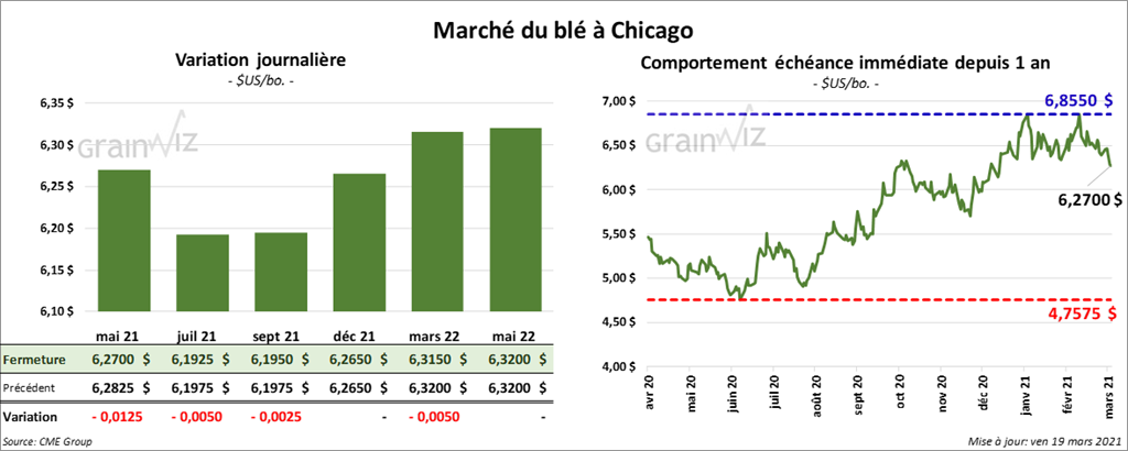 À Chicago, les contrats de blé aux échéances les plus rapprochées ont terminé la journée en baisse entre ¼ et 1 ¼ cents. À Kansas, les contrats de blé dur rouge aux échéances les plus rapprochées ont clôturé en recul entre ½ et 1 ½ cents. À Minneapolis, ceux de blé de printemps aux échéances les plus rapprochées ont fermé en hausse entre 1 ½ et 2 ½ cents.
