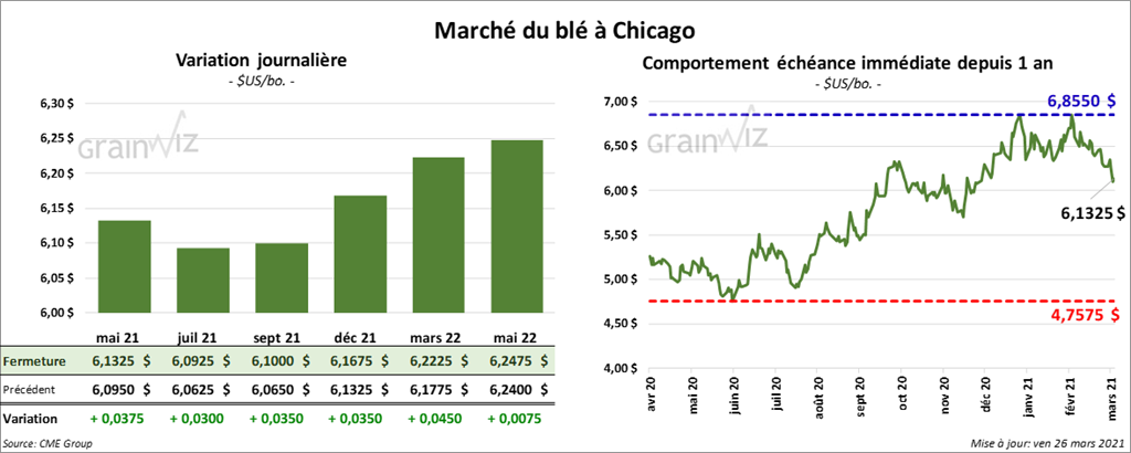 À Chicago, les contrats de blé aux échéances les plus rapprochées ont clôturé avec des gains entre 3 et 3 ¾ cents. À Kansas, ceux de blé de printemps aux échéances les plus rapprochées ont terminé la journée en hausse entre 1 ½ et 2 cents. À Minneapolis, les contrats de blé de printemps aux échéances les plus rapprochées ont fait l’inverse en fermant en baisse entre 1 ¼ et 3 ¾ cents.