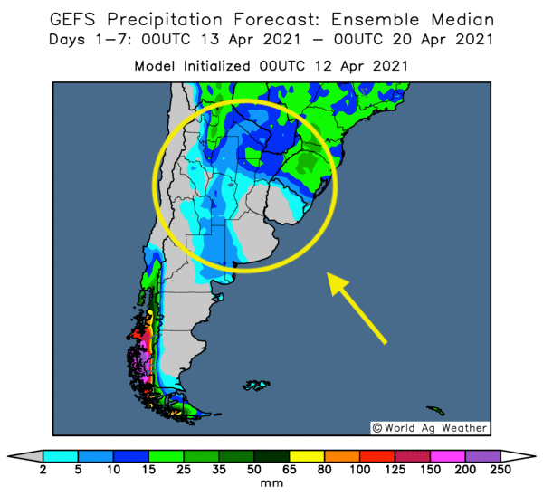 Cette carte montre les précipitations pour le centre de l'Argentine au cours des 1 à 7 prochains jours