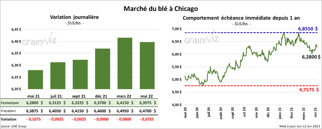 À Chicago, les contrats de blé aux échéances les plus rapprochées ont terminé la journée avec des pertes entre 9 et 10 ¾ cents. À Kansas, ceux de blé dur rouge aux échéances les plus rapprochées ont fermé en baisse de 7 ½ cents. À Minneapolis, les contrats de blé de printemps aux échéances les plus rapprochées ont clôturé dans le rouge entre 10 ¼ et 11 ¼ cents.