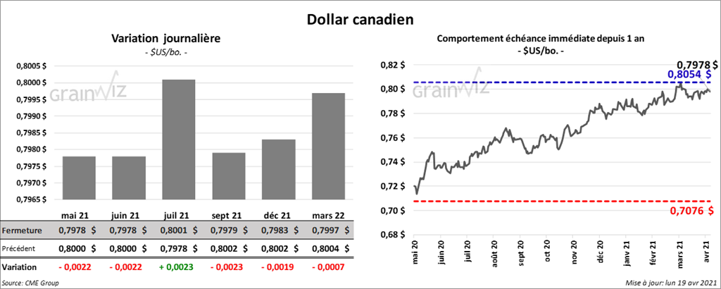 - Le rapport sur la progression des cultures montre qu’au 18 avril dernier, les ensemencements de soya US étaient terminés à 3 % alors que la moyenne des 5 dernières années est de 2 %. Les analystes s’attendaient à 3 %.