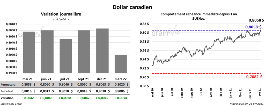 Les contrats de soya US aux échéances les plus rapprochées ont fini la session en hausse entre 21 ½ et 29 ¼ cents. Ceux de tourteau de soya US aux échéances les plus rapprochées ont également clôturé avec des gains entre 4,50 et 6,40 $/tonne. Les contrats d’huile de soya US aux échéances les plus rapprochées ont fermé dans le vert entre 128 et 250 points.