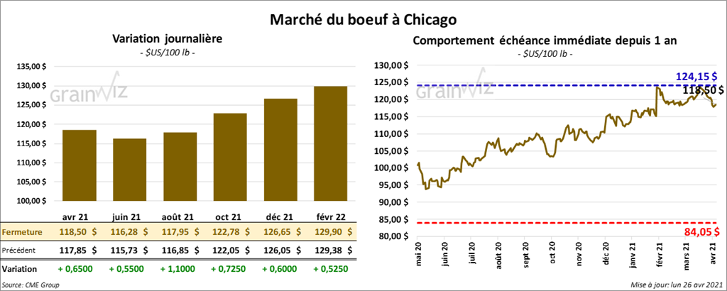 - Le 23 avril dernier, le CME Feeder Cattle Index était en baisse de 86 cents à 135,50 $.