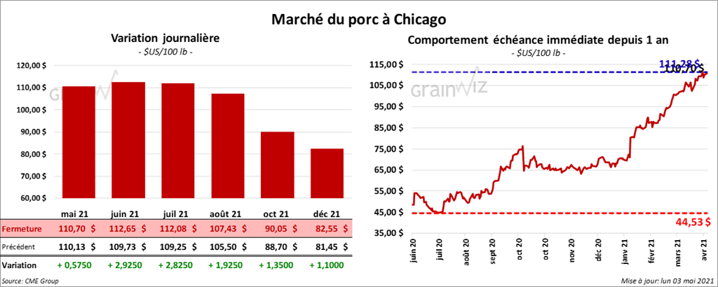 - Le 29 avril dernier, le CME Lean Hog Index était au neutre à 106,89 $.