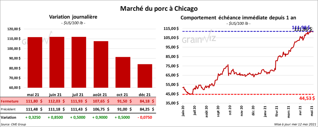 - Le 10 mai dernier, le CME Lean Hog Index était en hausse de 63 cents à 110,73 $.