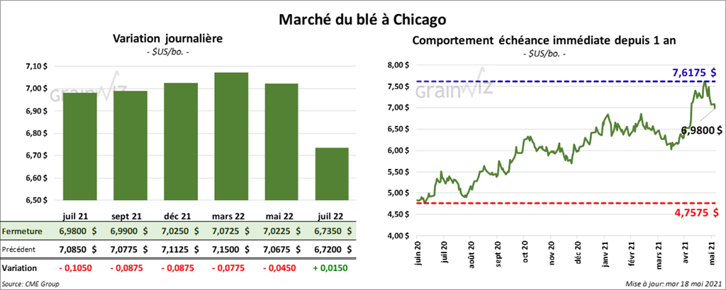 À Chicago, les contrats de blé US aux échéances les plus rapprochées ont terminé la session en baisse entre 7 ¾ et 10 ½ cents. À Kansas, les contrats de blé dur rouge aux échéances les plus rapprochées ont fini la séance en recul entre 3 et 4 ½ cents. À Minneapolis, ceux de blé de printemps ont également clôturé dans le rouge entre ¼ cent et 1,00 $.