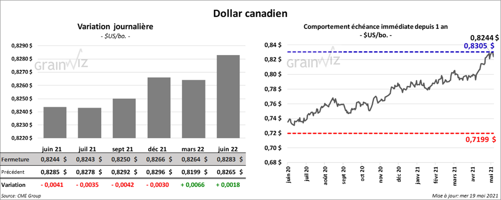- Vendredi, le rapport mensuel Cattle on Feed sera présenté. Les sondages montrent que pour le 1er mai dernier, les analystes anticipent une augmentation des inventaires des parcs d’engraissement de 3,7 % par rapport à la même période en 2020. Les placements sont aussi prévus à la hausse de 20,8 % comparativement à l’an dernier. Quant à la commercialisation en avril dernier, les attentes sont une augmentation de 33,6 % par rapport à l’an passé.