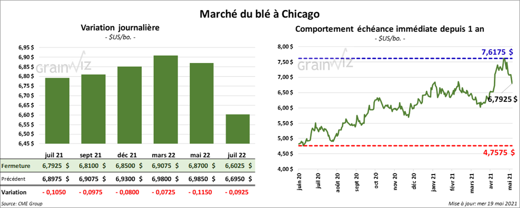 À Chicago, les contrats de blé aux échéances les plus rapprochées ont fini la journée dans le rouge entre 7 ¼ et 10 ½ cents. À Kansas, les contrats de blé dur rouge aux échéances les plus rapprochées ont fait de même en clôturant avec des pertes entre 12 ¼ et 14 cents. À Minneapolis, ceux de blé de printemps ont terminé la session en baisse entre 15 ¼ et 17 ¼ cents.