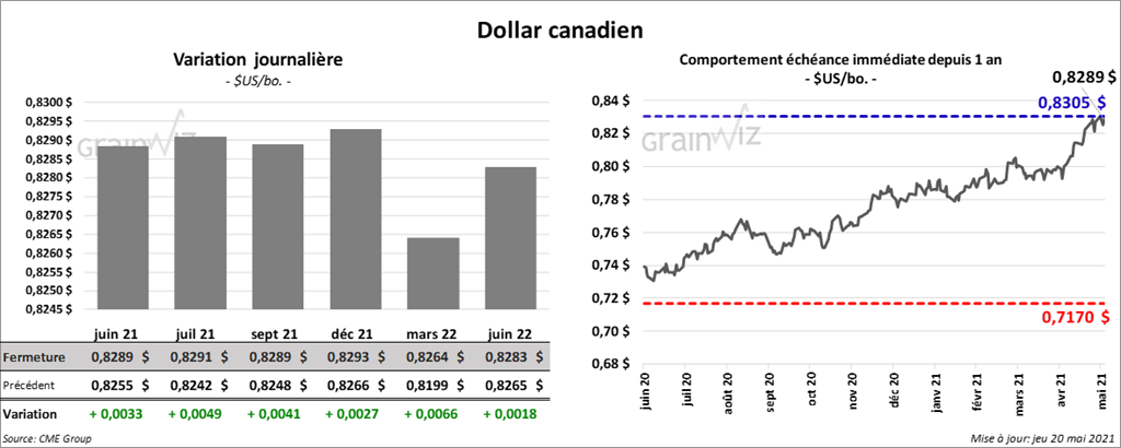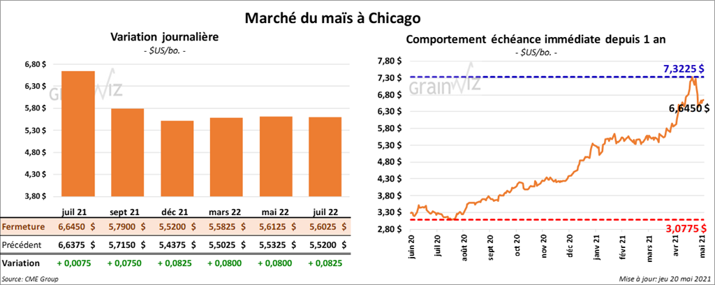 - Durant la semaine du 13 mai dernier, les ventes nettes à l’exportation de maïs US 2020/21 ont été une baisse notable par rapport à la semaine précédente à 277,600 tonnes. C’était par contre une augmentation de 19 % comparativement à la moyenne des 4 dernières semaines. Le Mexique et le Japon ont été les principaux acheteurs. Pour 2021/22, les ventes nettes à l’exportation de soya US ont été de 4,061,800 tonnes. La Chine et le Mexique ont été les plus gros acheteurs. Les projections des analystes étaient entre 2,7 et 4,9 millions de tonnes.