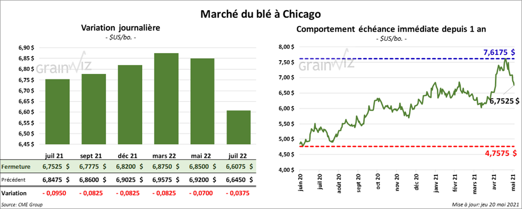 À Chicago, les contrats de blé aux échéances les plus rapprochées ont terminé la session dans le rouge entre 8 ¼ et 9 ½ cents. À Kansas, les contrats de blé dur rouge aux échéances les plus rapprochées ont fini la journée en recul entre 6 et 8 ¾ cents. À Minneapolis, ceux de blé de printemps aux échéances les plus rapprochées ont clôturé en baisse entre 1 ½ et 2 ¼ cents.