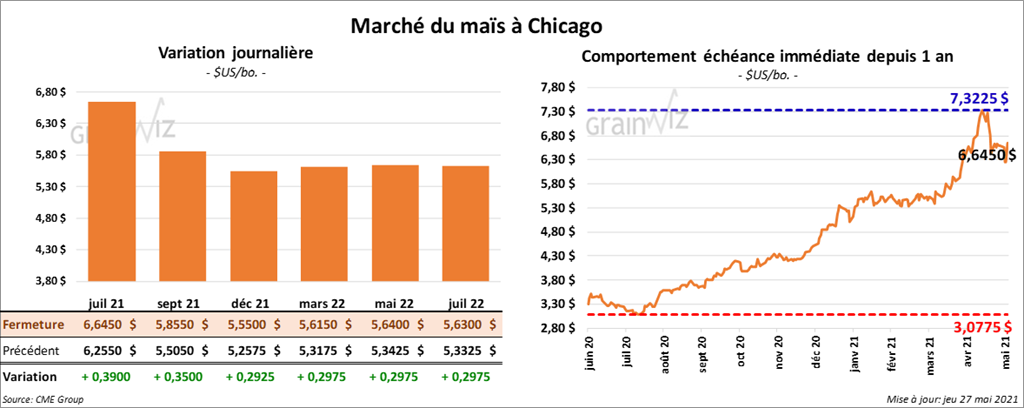 - Au cours de la semaine du 20 mai dernier, les ventes nettes à l’exportation de maïs US 2020/21 ont été de 555,900 tonnes alors que les attentes des analystes étaient entre -100,000 et 400,000 tonnes. C’était une augmentation notable comparativement à la semaine précédente comme par rapport à la moyenne des 4 dernières semaines. Le Mexique et la Chine ont été les plus gros acheteurs. Pour 2021/22, les ventes nettes à l’exportation ont été de 5,691,300 tonnes alors que les anticipations des analystes étaient entre 5,9 et 7,0 millions de tonnes. La Chine et le Panama ont été les principaux acheteurs.