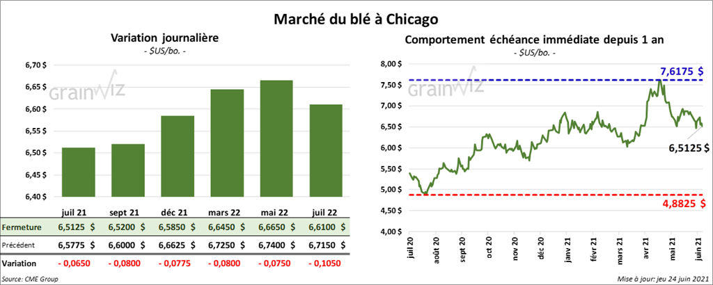À Chicago, les contrats de blé aux échéances les plus rapprochées ont clôturé en baisse entre 6 ½ et 8 cents. À Kansas, ceux de blé dur rouge aux échéances les plus rapprochées ont terminé la journée en recul entre 6 et 7 cents. À Minneapolis, les contrats de blé de printemps aux échéances les plus rapprochées ont fermé en hausse entre 1 et 4 ½ cents. Celui mars 2022 a fait exception en finissant en baisse de 1 ¼ cent.