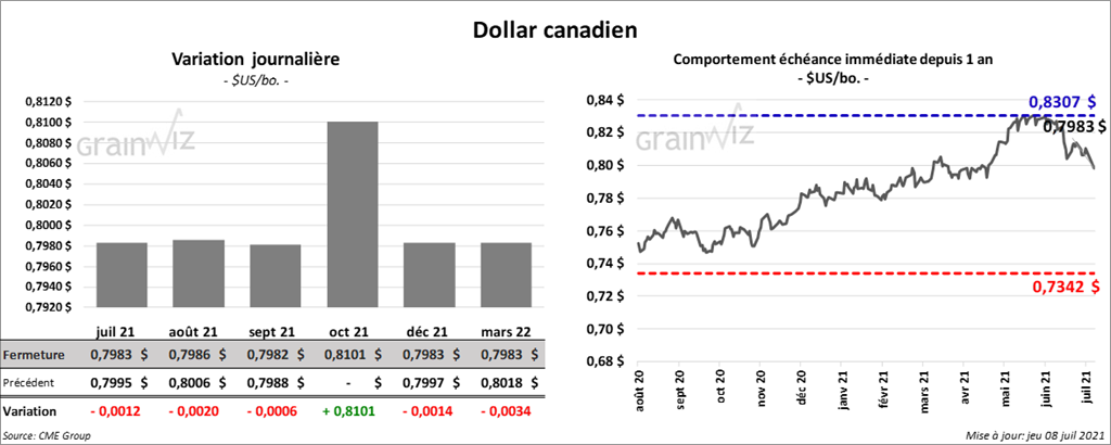 - La parution du rapport sur les ventes à l’exportation US de la semaine du 1er juillet dernier a été remise à demain en raison du congé du jour de l’Indépendance, mais les analystes s’attendent à ce que celles de maïs US soient entre 0 et 950,000 tonnes.