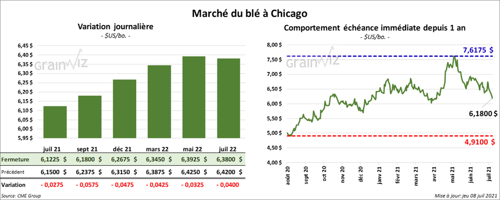 À Chicago, les contrats de blé aux échéances les plus rapprochées ont clôturé avec des pertes entre 4 ¼ et 5 ¾ cents. À Kansas, les contrats de blé dur rouge aux échéances les plus rapprochées ont fait l’inverse en fermant en hausse entre 2 ½ et 3 ½ cents. À Minneapolis, ceux de blé de printemps aux échéances les plus rapprochées ont fini la session en recul entre 2 et 3 cents.