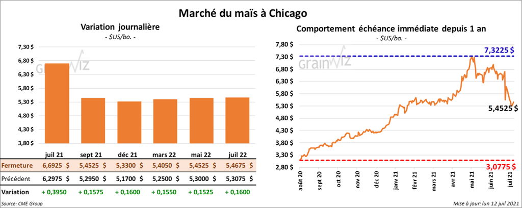 - Le rapport mensuel d’offre et de demande a été présenté ce midi. Pour le mois de juillet 2021/22, l’USDA a estimé que la production de maïs est de 15,165 milliards de boisseaux, ce qui est supérieur aux anticipations de marché établies à 15,115 milliards de boisseaux. Il s’agit aussi d’une augmentation de 1,2 % par rapport à juin 2021/22. Quant à la production finale de maïs US 2020/21, elle a été évaluée à 14,182 milliards de boisseaux.