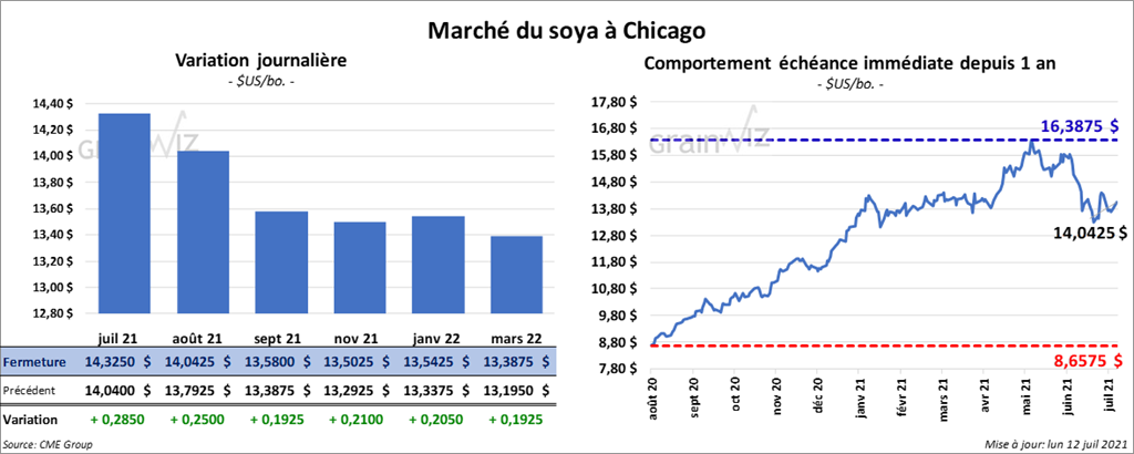 Les contrats de soya US aux échéances les plus rapprochées ont fini la journée en hausse entre 19 ¼ et 25 cents. Ceux de tourteau de soya US aux échéances les plus rapprochées ont fait de même en clôturant avec des gains entre 2,90 et 3,60 $/tonne. Les contrats d’huile de soya US aux échéances les plus rapprochées ont fermé dans le vert entre 151 et 170 points.