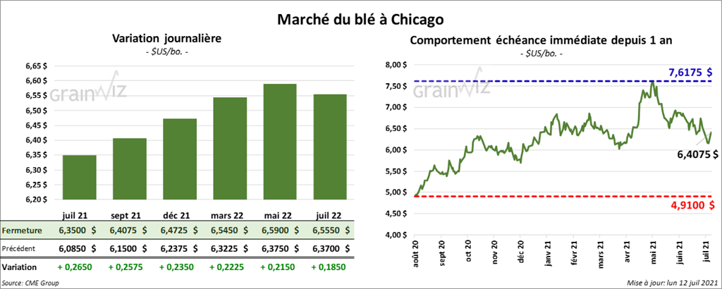À Chicago, les contrats de blé aux échéances les plus rapprochées ont terminé la séance en hausse entre 22 ¼ et 25 ¾ cents. À Kansas, les contrats de blé dur rouge aux échéances les plus rapprochées ont fermé en progression entre 20 ¼ et 21 ¼ cents. À Minneapolis, les contrats de blé de printemps aux échéances les plus rapprochées ont fini la journée avec des gains entre 31 ¼ et 43 cents.
