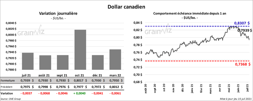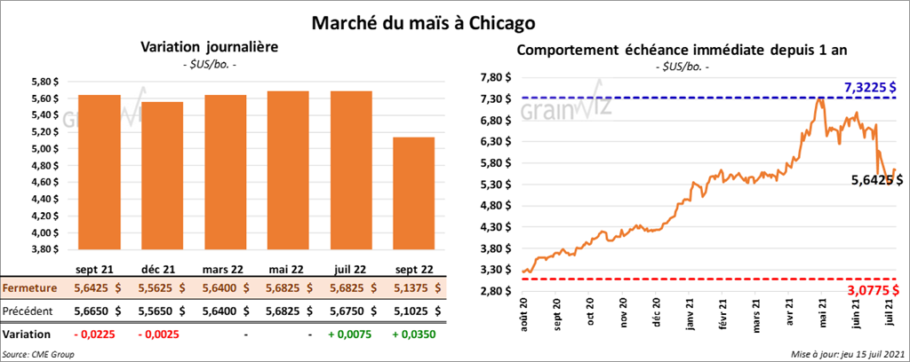 - Durant la semaine du 8 juillet dernier, les ventes à l’exportation de maïs US 2020/21 ont été en baisse de 20 % comparativement à la semaine précédente à 138,800 tonnes. Par contre, c’était une augmentation de 31 % par rapport à la moyenne des 4 dernières semaines. Le Japon et le Mexique ont été les plus gros acheteurs. Pour 2021/22, les ventes à l’exportation ont été de 133,200 tonnes. Les destinations inconnues et le Mexique ont été les principaux acheteurs. Les attentes des analystes étaient entre 50,000 et 900,000 tonnes.