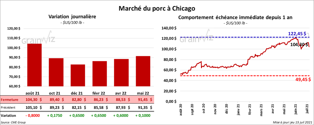 Les contrats de porc US aux échéances les plus rapprochées ont terminé la journée en hausse entre 17 et 65 cents. Celui août 21 a fait exception en finissant en baisse de 80 cents.