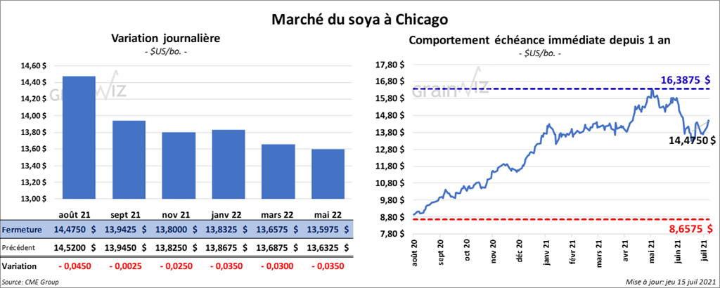 Les contrats de soya US aux échéances les plus rapprochées ont fini la journée en recul entre ¼ et 4 ½ cents. Ceux de tourteau de soya US aux échéances les plus rapprochées ont également fermé dans le rouge entre 6,00 et 7,00 $/tonne. Les contrats d’huile de soya US aux échéances les plus rapprochées ont terminé avec des gains entre 109 et 113 points.
