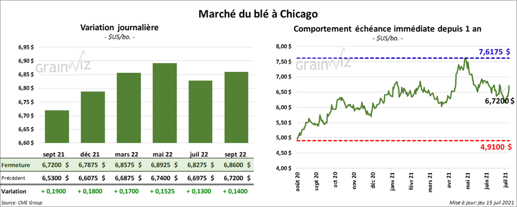 À Chicago, les contrats de blé aux échéances les plus rapprochées ont fini la journée en hausse entre 15 ¼ et 19 cents. À Kansas, ceux de blé dur rouge aux échéances les plus rapprochées ont clôturé avec des gains entre 10 ¾ et 12 ½ cents. À Minneapolis, les contrats de blé de printemps aux échéances les plus rapprochées ont également terminé en progression entre 21 ¼ et 21 ¾ cents.
