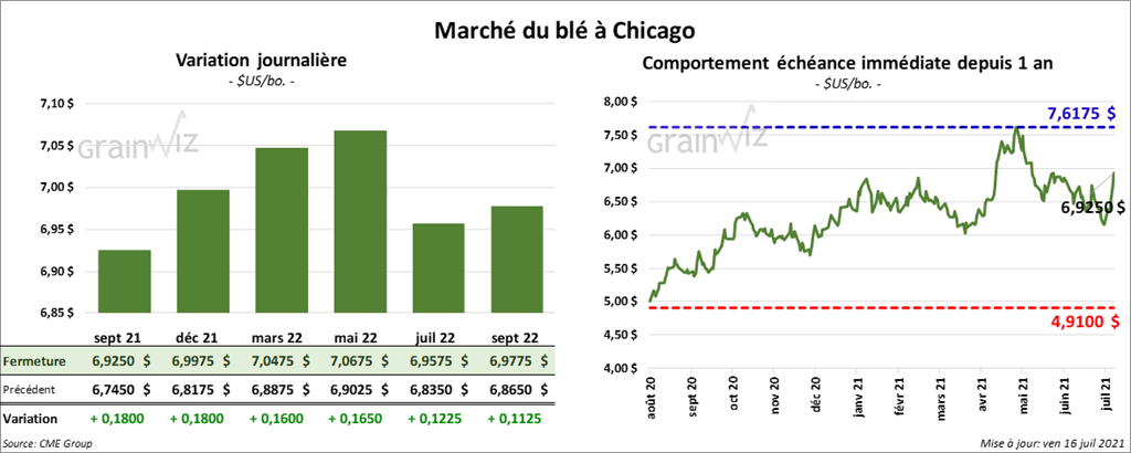 À Chicago, les contrats de blé aux échéances les plus rapprochées ont fini la journée en hausse entre 16 et 18 cents. À Kansas, ceux de blé dur rouge aux échéances les plus rapprochées ont aussi terminé la session en progression entre 9 et 11 ¼ cents. À Minneapolis, les contrats de blé de printemps aux échéances les plus rapprochées ont clôturé dans le vert entre 23 ¼ et 25 ½ cents.