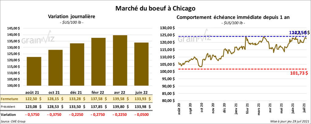 Les contrats de bœuf US aux échéances les plus rapprochées ont fini la session en baisse entre 22 et 57 cents. Ceux de veau US aux échéances les plus rapprochées ont également clôturé avec des pertes entre 1,22 et 1,67 $.