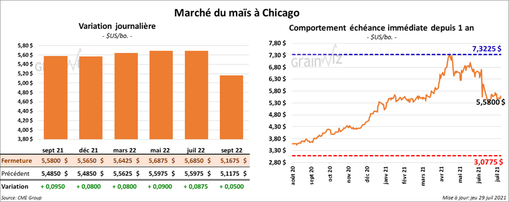 Les contrats de maïs US aux échéances les plus rapprochées ont terminé la journée en hausse entre 8 et 9 ½ cents.